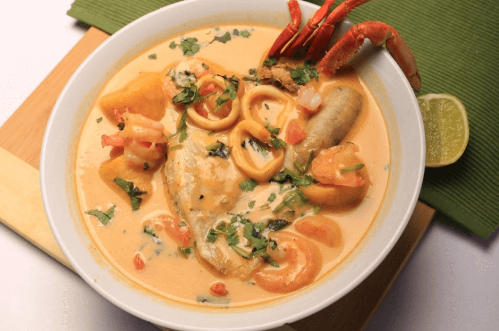 Esta sopa incluye mariscos como cangrejos, caracol, camarón, pescado y calamar.