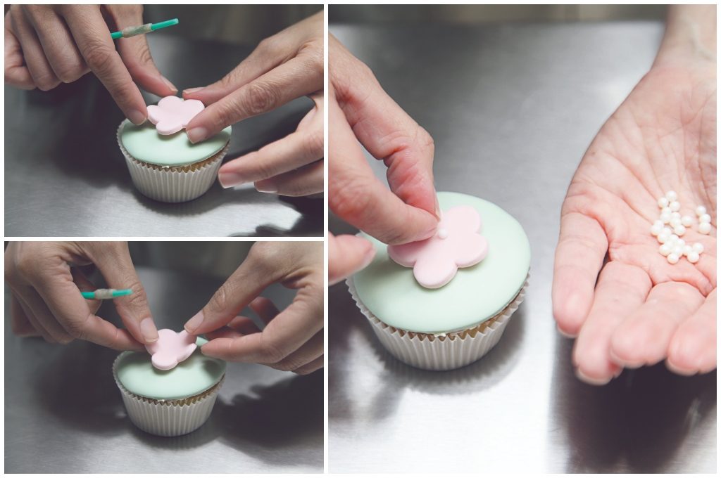 Toque final. Colocar la flor (con la parte que se pinceló con agua) sobre el fondant, el agua hace la función de pegamento entre el fondant. Presionar un poco y colocar perlas comestibles en el centro de la flor.
