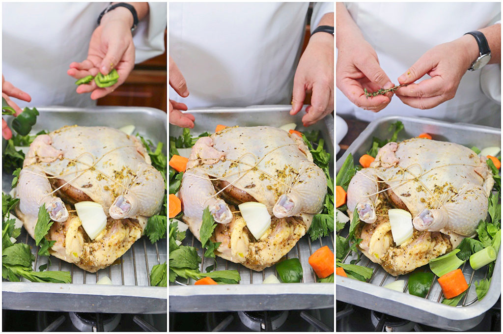 todos los vegetales del horneado cortados en trozos: 1 chile verde, ½ cebolla, 1 zanahoria, 1 rama de puerro, 2 ramas de apio, hojas de laurel, tomillo y perejil al gusto.