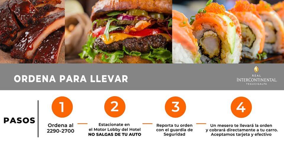 Es uno de los hoteles que ofrece el servicio más completo de ordenar para llevar. Tienen una amplia variedad en su menú, como sushi, pizzas, hamburguesas, carnes, así como vinos y servicio de repostería. Lo único que debes hacer es llamar con antelación al teléfono 2290-2700 y ordenar lo que desees. Puedes cancelar con tarjeta de crédito y débito, o si lo prefieres con efectivo.