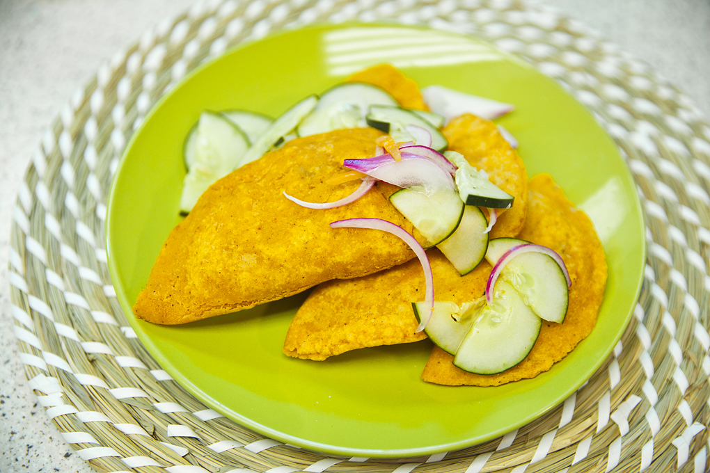 Precalentar en un sartén con aceite, ½ de cebolla, seguidamente añade ½ de chile, ajo, tomate y pasta de tomate mescla todo. Deshilachar la pechuga de pollo añadir una taza de agua y dejar sofreír. Forma las bolitas de la masa y hacer una totilla coloca el relleno y coloca a freír.