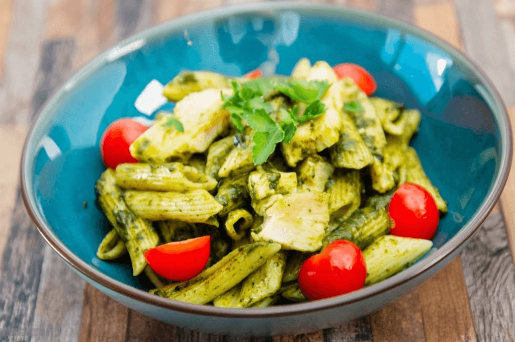 Pasta penne al pesto con pollo y vegetales Almuerzos, Cenas