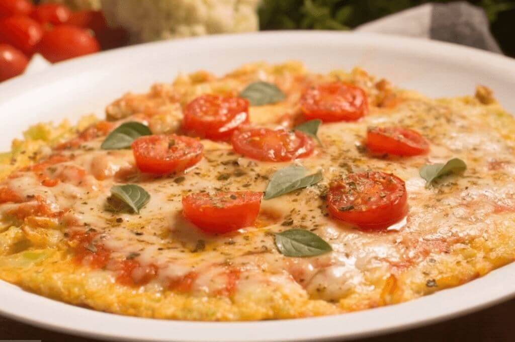 Pizza con masa de coliflor, tomate cherry y queso Almuerzos, Cenas