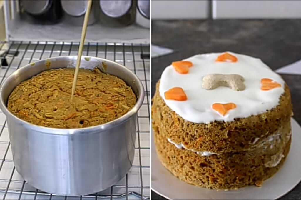 Después debe llevar la mezcla al horno a precalentado a 355°F por 45 minutos. Recuerda realizar la prueba del palillo para asegurarte de que el pastel esté cocinado. Para finalizar, puedes agregar un poco de yogur natural al pastel y algunas frutas que no sean dañinas para tu perro. Y listo, ya puedes consentir a tu perrito en un día especial.
