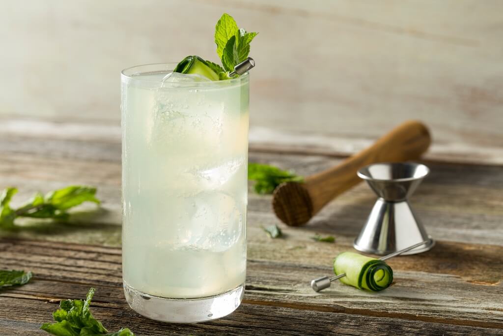 Decora con pepino y una hojita de menta para darle elegancia a tu coctel.