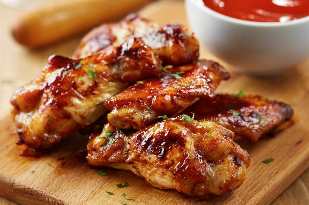 Lavar 2 libras de alas de pollo y condimentar con 1 cucharadita de sal y 1 cucharadita de pimienta, ½ cucharadita de paprika y la mitad de ½ taza de aceite vegetal mezclar bien y dejar marinando mínimo 4 horas. Aparte picar ½ cebolla amarilla y 4 dientes de ajo finamente, en una sartén colocar el resto del aceite y sofreír la cebolla y el ajo hasta acitronar, luego agregar 4 cucharadas de jugo de piña, 1 taza de kétchup, 1 cucharadita de humo líquido y 3 cucharadas de azúcar, dejar reducir. Llevar las alas marinadas a una placa para horno y agregar la salsa ya hecha y hornear por 30 minutos a 375 °F bien tapadas y los últimos 15 minutos destapar para dorar.