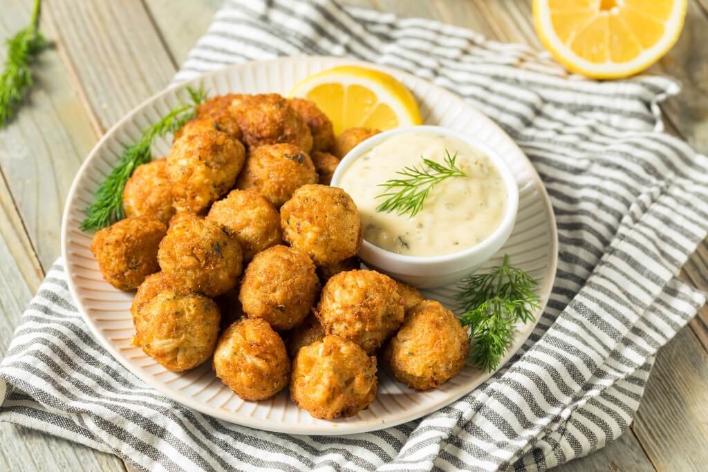 En un procesador triturar 4 filetes de róbalo y 1 libra de camarones limpios. Mezclar con 1 huevo, ralladura de limón, 3 cucharadas de miga de pan, 1 cucharadita de paprika, 1 cucharada de eneldo picado, 1 rama de cilantro fino picado, 1 cucharada de harina y salpimentar al gusto. Formar las albóndigas y llevar al congelador por 40 minutos. Precalentar el aceite en una sartén profunda, retirar las albóndigas del congelador, pasar por 1 huevo batido y luego por harina, freír hasta que estén doradas. Escurrir sobre papel toalla para eliminar el exceso de aceite y servir con la salsa tártara.