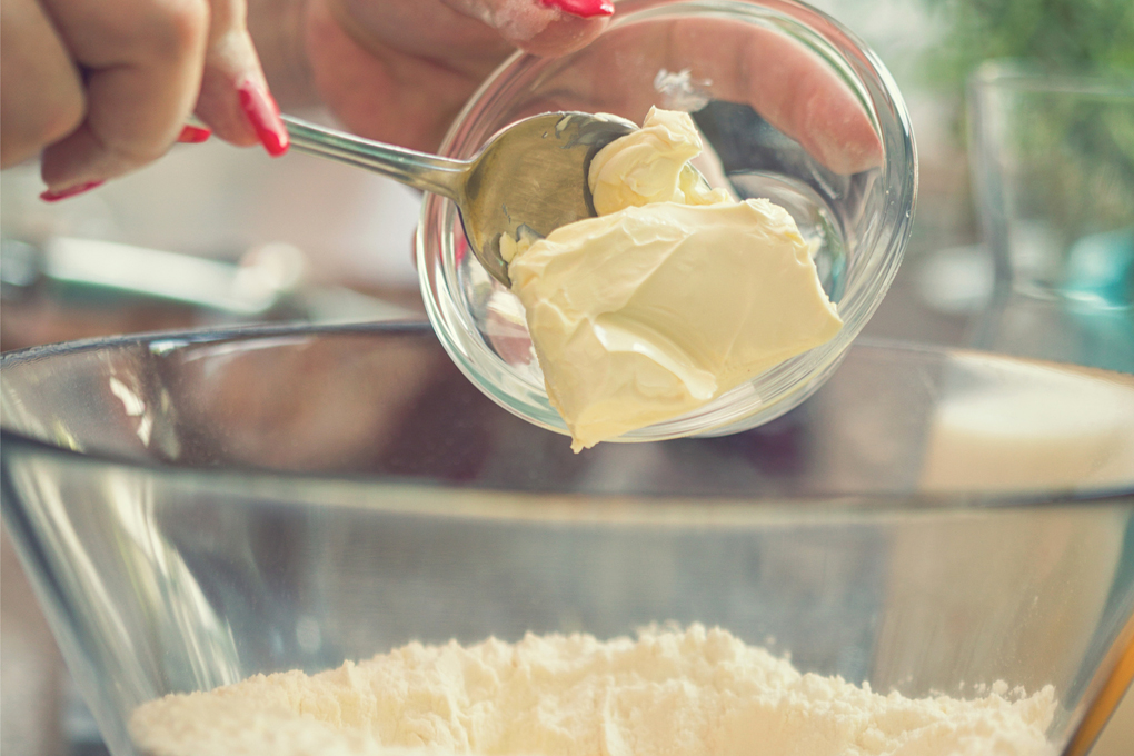 Sumar a la mezcla anterior ¼ taza de mantequilla amarilla en barra y a temperatura ambiente. Mezclar con una batidora eléctrica hasta integrar todo.