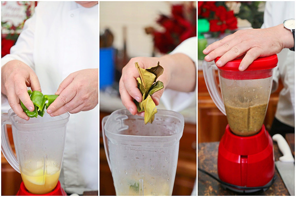 Poner en la licuadora 2 tazas de jugo de naranja, 1 cebolla mediana cortada en trozos, 1 chile verde en trozos, 1 cabeza de ajo, 1 cucharadita de sal, pimienta, laurel y tomillo molidos, 1 taza de hojas de limón, orégano seco al gusto, ½ taza de vino blanco, 1 cucharada de semillas de mostaza y 1 cucharada de semillas de culantro. Procesar hasta que todo esté completamente integrado y la marinada esté lista.