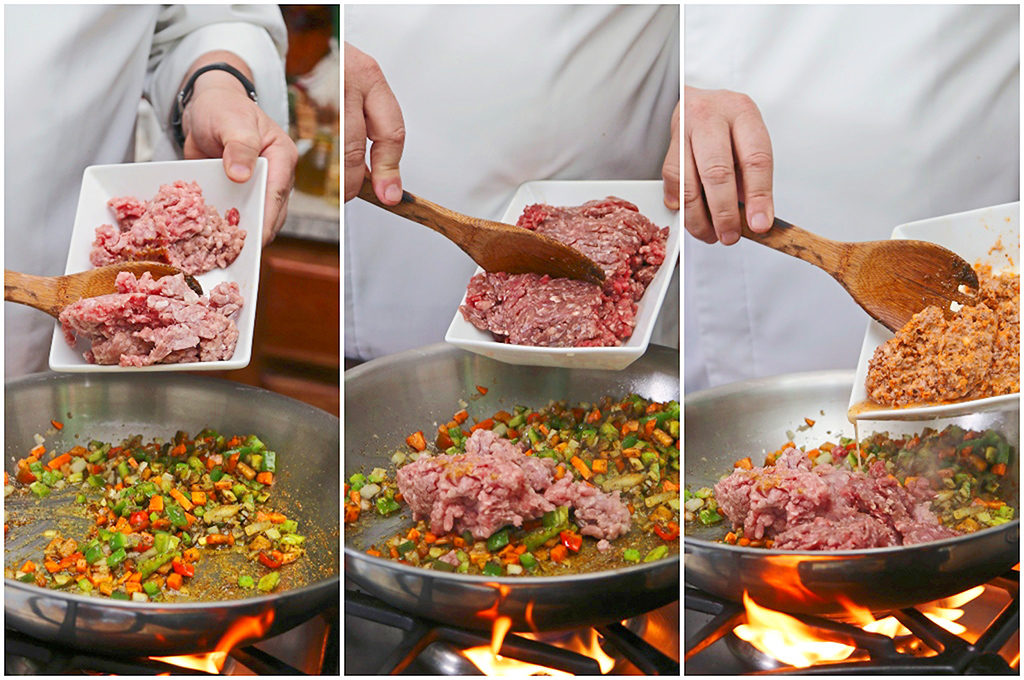 Agregar a los vegetales 1 libra de carne molida de res, 1 libra de carne molida de cerdo y ½ libra de chorizo de cerdo a granel; mezclar hasta integrar bien y dejar cocinar por unos minutos.