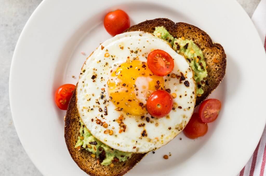 Tostar 1 rebanada de pan integral, machacar sobre la tostada ¼ de aguacate, añadir 1 huevo estrellado, espolvorear especias naturales y añadir 5 tomates cherry cortados por mitad.