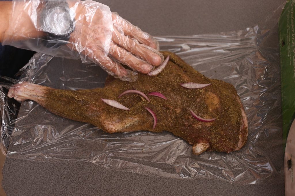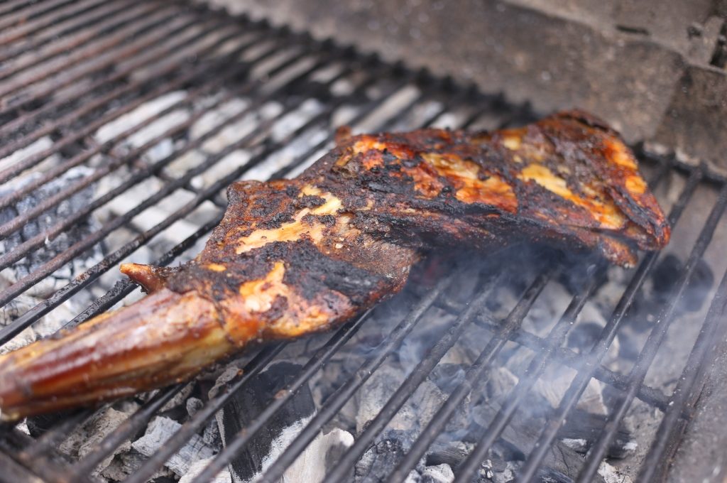 Encender el anafre. Llenar el anafre de carbón, dejando encendido solo la mitad. En el lado más caliente colocar el cordero para sellarlo por ambos lados por 5 minutos.