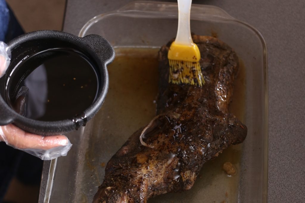 Para brochar. Brochar la pieza se debe preparar un marinado con aceite saborizado con ajo, cilantro, romero o chile cabro. Esto para que se le pegue bien el marinado a la carne y quede dorado.