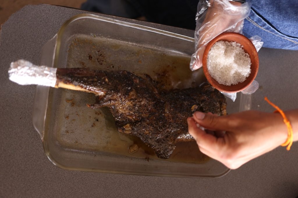 Rectificar sazón. Rociar con la sal parrillera por ambos lados justo antes de llevar a la parrilla para sellar el cordero.