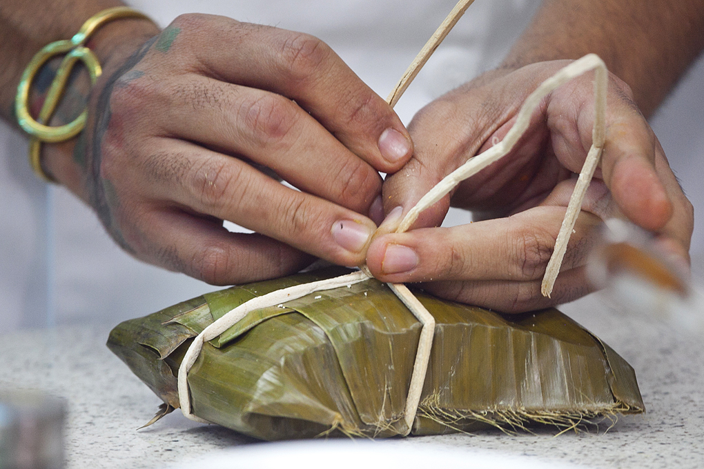 Cuando el tamal esté bien envuelto, colocar las hojas de cierre hacia abajo. Con ayuda de una tira de amarre, asegurar el tamal. El chef Carlos Espinal, recomienda primero colocar la tira de amarre a lo ancho del tamal, y luego se hace una vuelta en cruz.