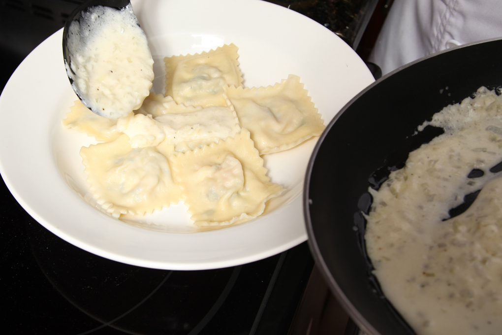 Al servir. Colocar los raviolis en un plato, verter la salsa y decorar con las almendras fileteadas y hojas de tomate confitadas.