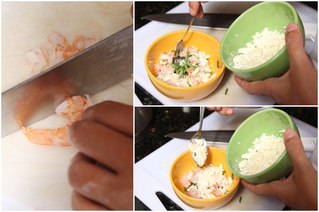 Mezcla para el relleno. Picar los camarones y la espinaca, unir en un tazón junto con el queso feta. Reservar.