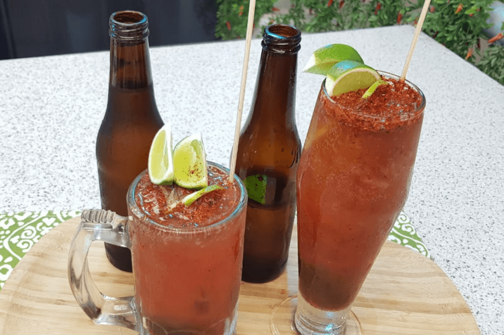 Llenar 2 vasos cerveceros con hielo, colocar la mitad del jugo de tomate en cada uno, 1 cucharada de salsa inglesa, Tajín, limón y picante al gusto. Terminar con la cerveza y decorar con rodajas de limón.