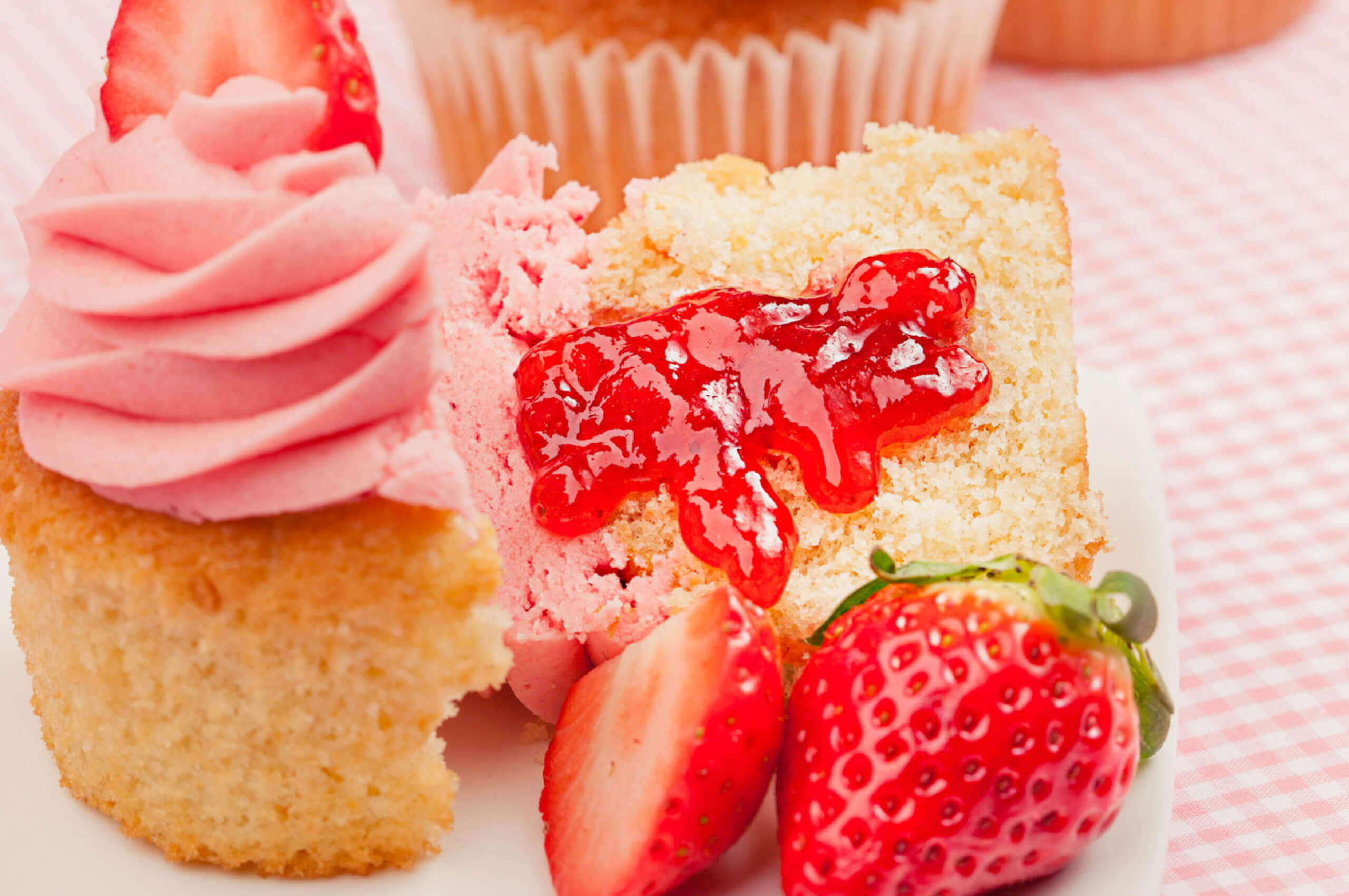 Para el relleno: Licuar las fresas con el agua y el jugo de limón. Verter la mezcla en una cacerola, añadir 1 taza de azúcar y cocinar a fuego lento por 30 minutos o hasta espesar. Remover y dejar enfriar. Colocar la mermelada en una manga pastelera y con la punta hacer un agujero en el centro de cada cupcake y rellenar. Decorar los cupcakes con frosting rosado y con la mitad de una fresa.