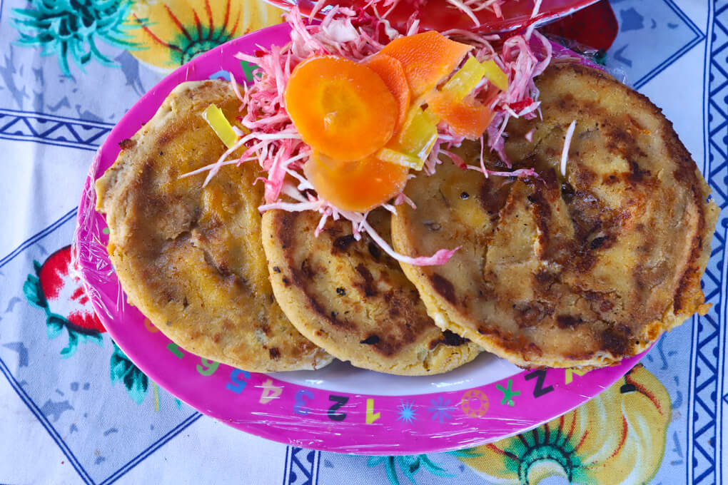 Se pueden encontrar pupusas elaboradas de quesillo y con chicharrón, acompañadas de un exquisito encurtido de repollo.