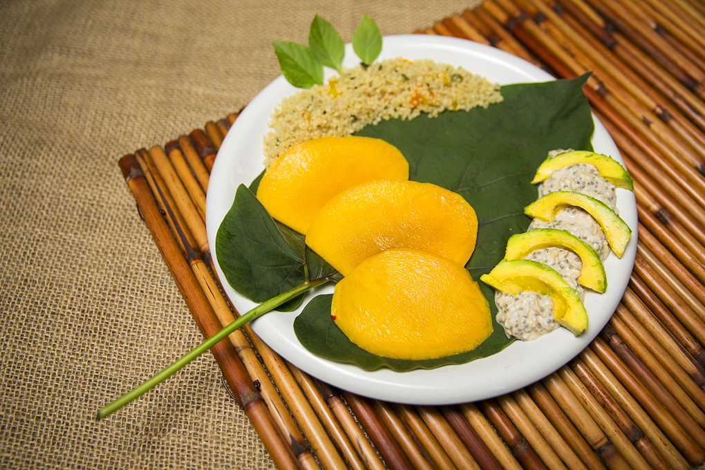 Su oferta gastronómica es muy variada y satisfacen todo tipo de gustos con opciones hasta para veganos. Esta opción para almuerzo, tiene como base una hoja de juniapa con porciones de avena y chía con leche de almendras. Va acompañado de aguacate, quinoa con coloridos chiles morrones, albahaca y mango en rodajas, un platillo perfecto para la comunidad vegana en Tegucigalpa.
