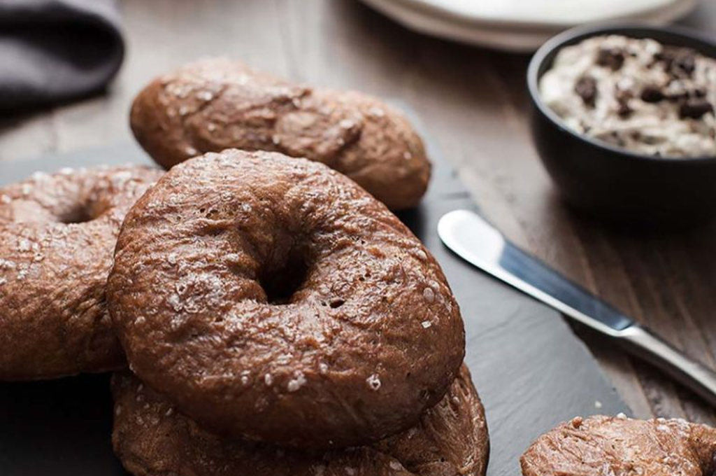 Al obtener una masa que no se pegue en los dedos, dejar reposar 15 minutos. Amasar de nuevo y agregar 1 cucharada de cacao en polvo, formar los bagels. Dejar reposar 15 minutos y llevar a una olla con agua hirviendo y sumergir cada uno por 6 minutos. Retirar y meter al horno en una bandeja engrasada, hornear por 22 minutos a 360 ºF. Retirar y enfriar para rellenar con queso crema preparado con galletas de chips de chocolate trituradas.
