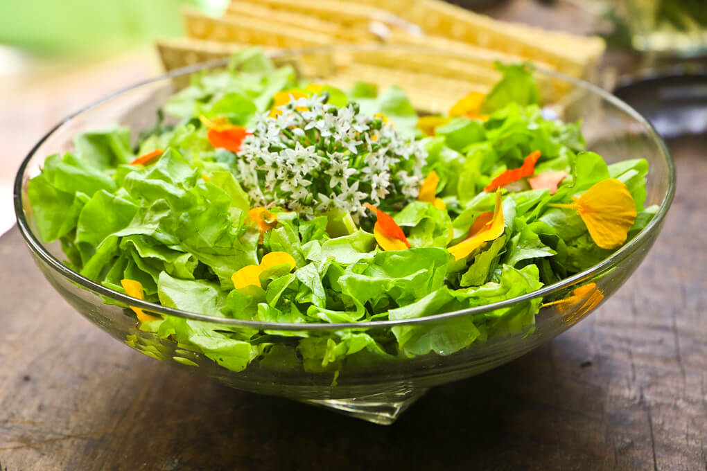 Prepara una ensalada, agregando flores de cebollina como toque final, flores de arúgula (tiene un sabor amargo especial para ensaladas) y flores de capuchina para añadir un color atractivo. Acompáñalo con la vinagreta o el aderezo de tu elección.