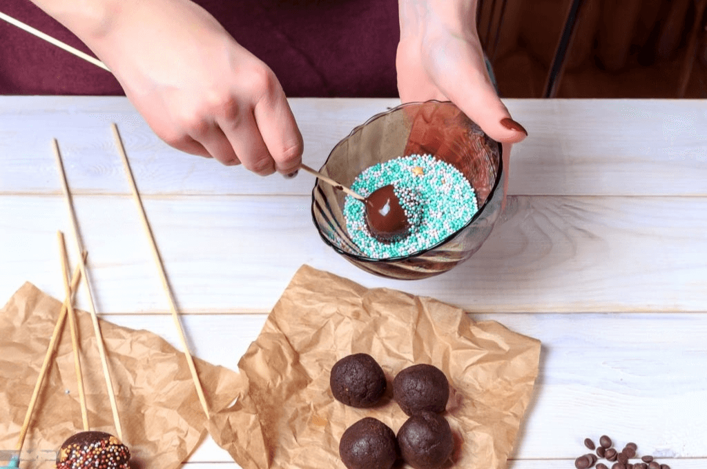 Pasado este tiempo, formaremos las pequeñas esferas e introduciremos los palitos de madera hasta la mitad, volvemos a meter al refrigerador por 1 hora. Mientras se congelan, derrite el chocolate de tu preferencia, ya sea chocolate negro, blanco o de leche. Sumerge cada bola en el chocolate derretido, asegurándote de que quede completamente cubierta. Deja que el exceso de chocolate gotee y luego coloca las bolas nuevamente en la bandeja con papel pergamino.