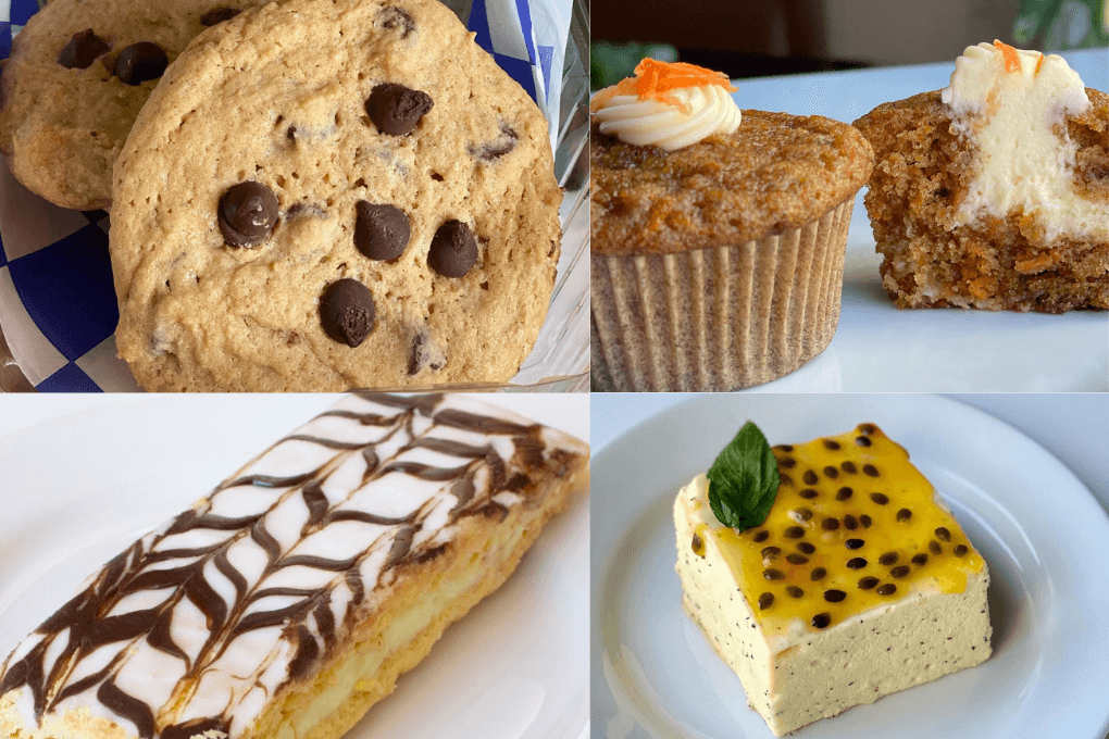 Entre algunos de sus postres podemos encontrar los muffins de fresa con trocitos de queso, de zanahoria relleno de cream cheese, chocolate con topping de cremma de maní, caramelo y trocitos de snikers y de limón con topping de mora.
