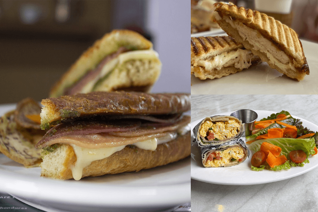 Además, si deseas algo más elaborado, puedes optar por un wrap de huevo con vegetales, pollo a la plancha, cebolla caramelizada y queso mozzarella, sándwich de pasta de pollo con o sin hongos salteados, tostada di salmone, panini di lucca de jamón, salami, queso mozzarella o salsa pesto de la casa.