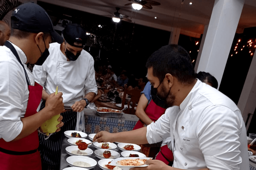 Los tres chefs unieron su destreza en la cocina y conocimientos culinarios, junto a un gran equipo de jóvenes voluntarios, para hacer de esta cena icónica, una noche lleva de sabores y presentar un trabajo bien elaborado. Gracias la gran equipo confirmado, realizaron una espectacular cena de cinco tiempos, con ingredientes locales, que incluyó pacaya con mayonesa de tocino y gel de limón, unas costillas de cerdo al café con puré de camote y calabaza; entre otros platillos exquisitos.
