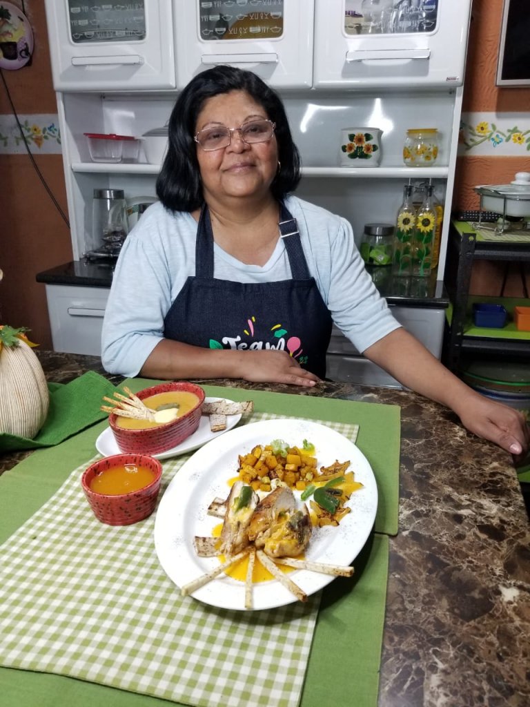 Así mismo, desde la cocina de doña Fátima Ávila se sazonaba un pollo relleno con queso y chile jalapeño, rebosado en una salsa de maracuyá, albaricoque y chile piquín, Mientras removía una crema de malanga, se podía observar mucha técnica por parte de la aficionada a la cocina.