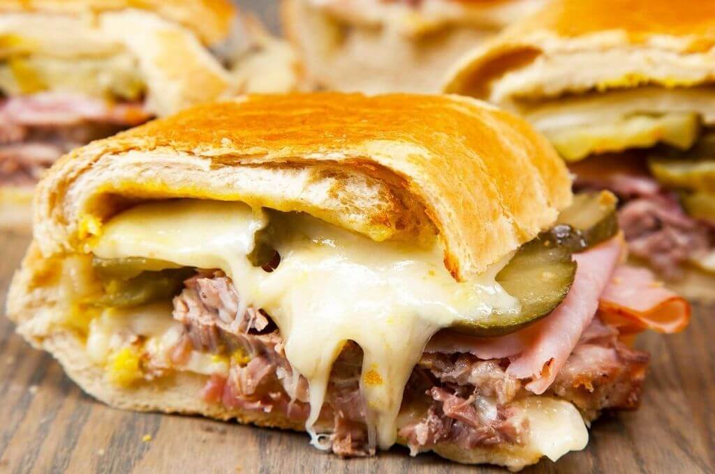 El cubano es un sándwich relleno de cerdo asado, jamón, queso suizo, pepinillos y mostaza, prensado y tostado en una plancha hasta que el queso se derrite y el pan se vuelve dorado y crujiente. Una joya de la comida callejera de Miami.