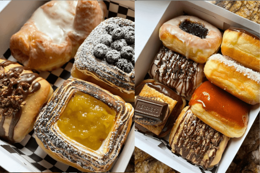 El menú cuenta con donas rellenas que van desde sabores clásicos como boston cream hasta algunas más exóticas como blueberry lemon, crema de jamaica y baileys cream. También hay una sección de donas un poco más elaboradas que tienen pétalos de rosas comestibles y oro de 24K. Pero también están los sabores clásicos como las donas de vainilla, almendra, s’mores, coco y algunas con cereales.