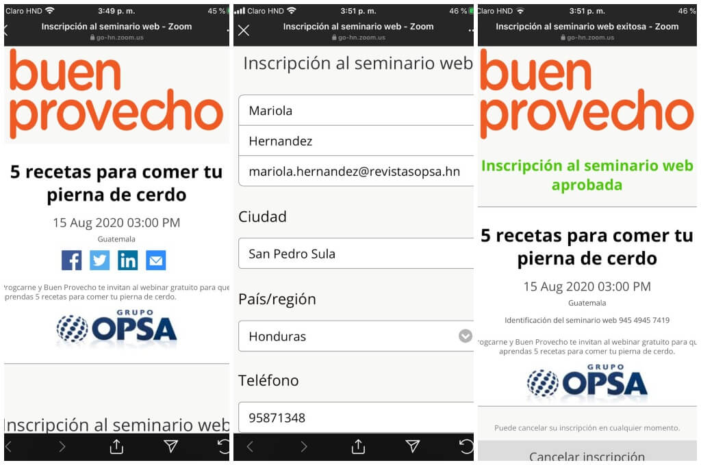 Inmediatamente te caerá un correo electrónico confirmando tu cupo y sólo debes esperar a que llegue la fecha y la hora para ser parte de este increíble webinar que se estará impartiendo gracias a Progcarne, Buen Provecho, Mazola y Maseca.