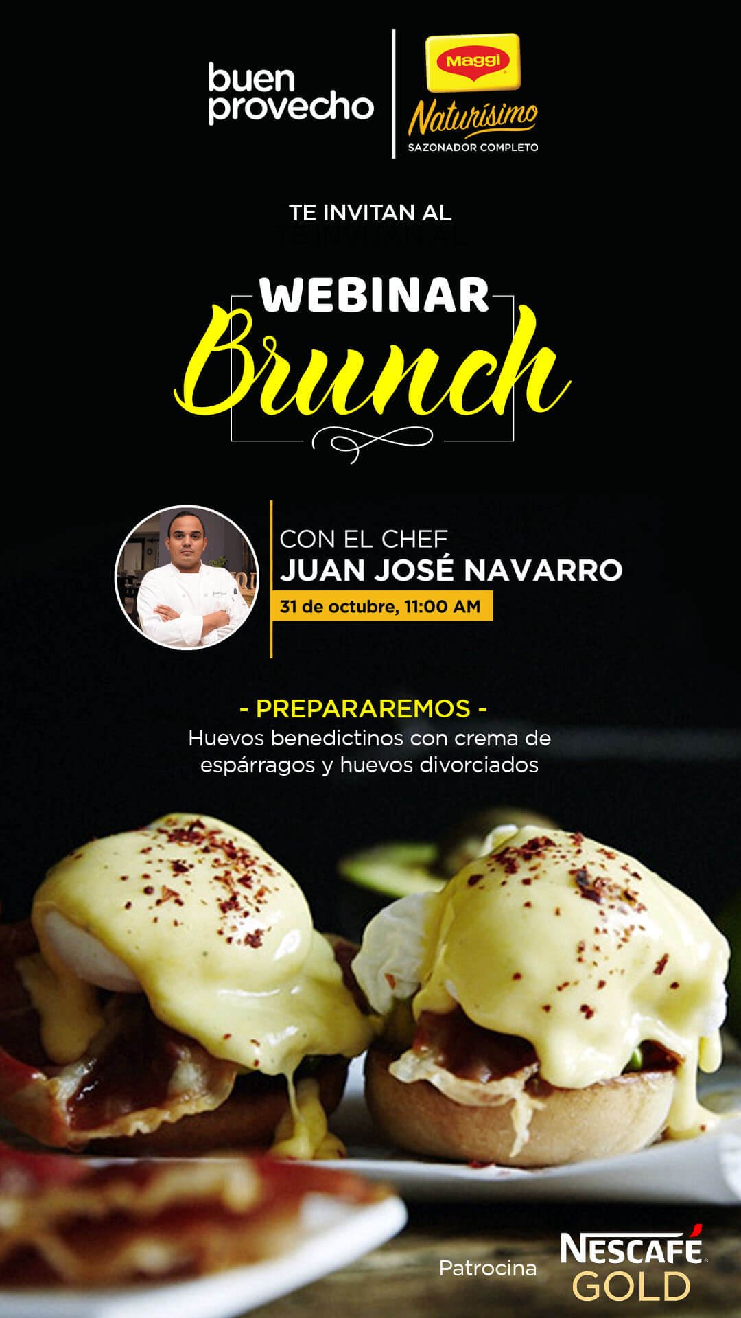No te pierdas el próximo webinar de Brunch preparado por Buen Provecho junto al sazonador completo Naturísimo de Maggi, y con el patrocinio de Nescafé . La cita es este sábado 31 de octubre a las 11:00 AM y el chef que estará impartiendo todo su conocimiento es el talentoso Juan José Navarro. ¡No te lo puedes perder!