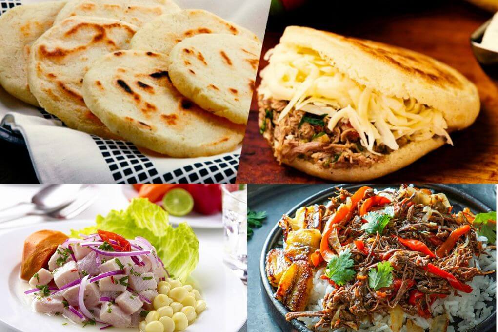 Colombia y Venezuela, Arepas: Las populares arepas consisten en pan plano de masa de maíz o harina, relleno con queso, carne, aguacate y frijoles negros; una verdadera delicia criolla.