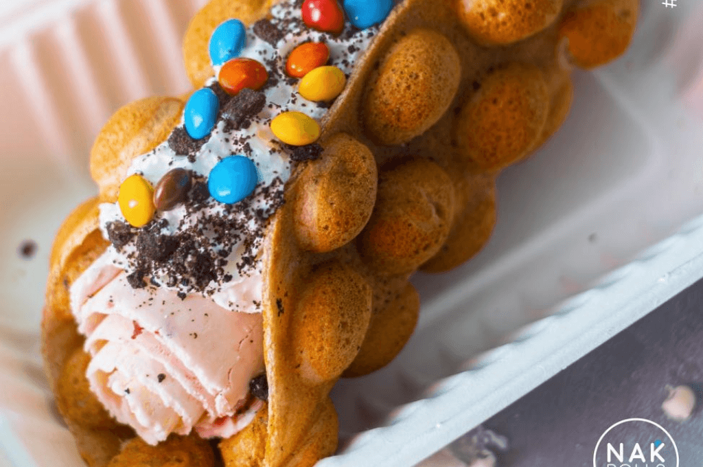 También, no puede faltar el deliciosos flan con caramelo, el cual es demasiado tentador con solo verlo servido, la combinación de flan con caramelo es exquisita y hace que se haga agua la boca. Los ricos bubble waffles son waffles “burbuja” recién hechos, con su deliciosa receta secreta de helado. Puedes rellenar cada bolita de waffle con tu topping favorito como por ejemplo: Chispas de chocolate.