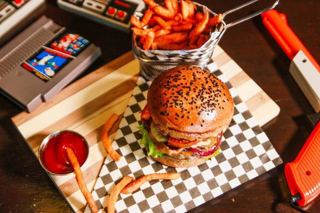 Como parte del concepto del restaurante, cada hamburguesa tiene un nombre específico de algún videojuego. Como la hamburguesa “NES” (consola clásica de Nintendo), por esa razón decidieron nombrar así a la hamburguesa clásica, que se compone por 5.5 onzas de torta de carne, lechuga, pepinillos, tomate, queso cheddar, cebolla morada y la salsa de la casa, todo entre dos rodajas de pan artesanal.