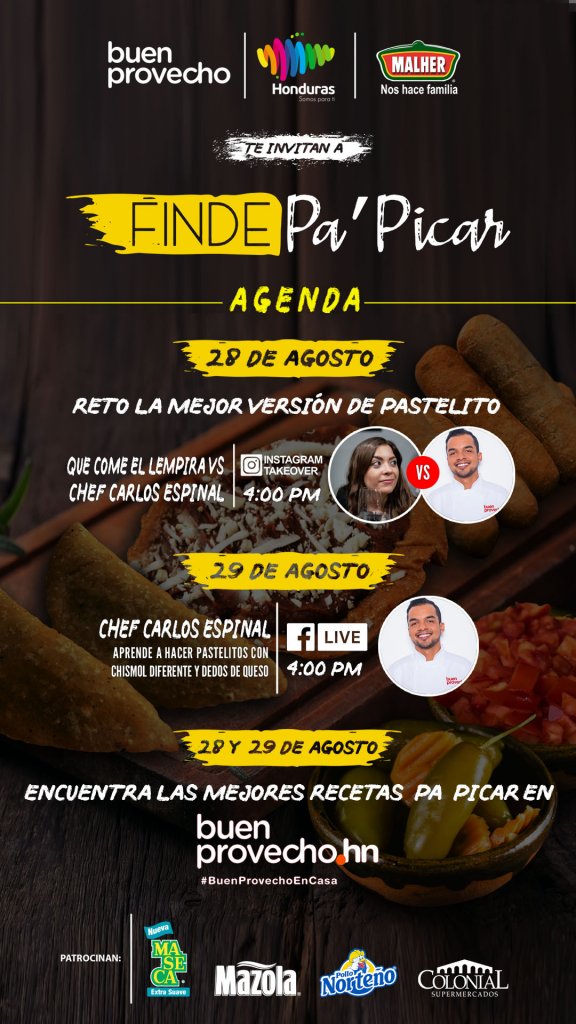 Cuando se acerca el fin de semana todos buscamos qué bocadillos preparar para las reuniones familiares y con amigos. Y aunque existe una infinidad de opciones, no existe nada mejor que optar por esos bocadillos hondureños que tanto nos encantan. Es por eso, que Buen Provecho, Marca País Honduras y Malher te invitan a unirte a todas las actividades que tendremos en nuestro Finde Pa’ Picar junto al patrocinio de Maseca, Mazola y Pollo Norteño.