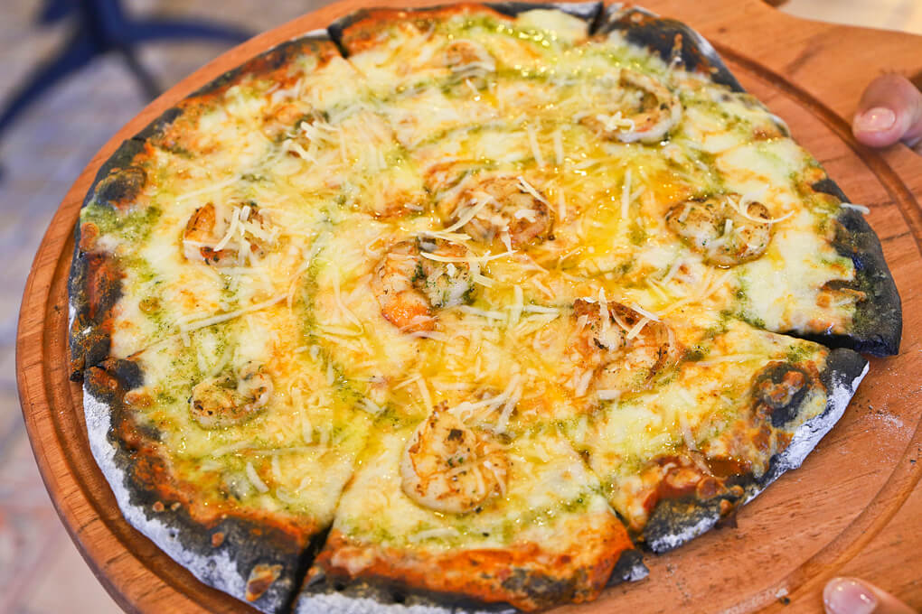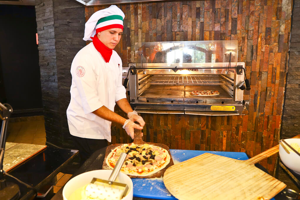 La especialidad de la casa son las pizzas artesanales especialmente preparadas en horno de piedra con ingredientes frescos y listas para servir. La selección especial del chef es la pizza «portobello” y la pizza “marinera” con ingredientes del mar como el camarón.