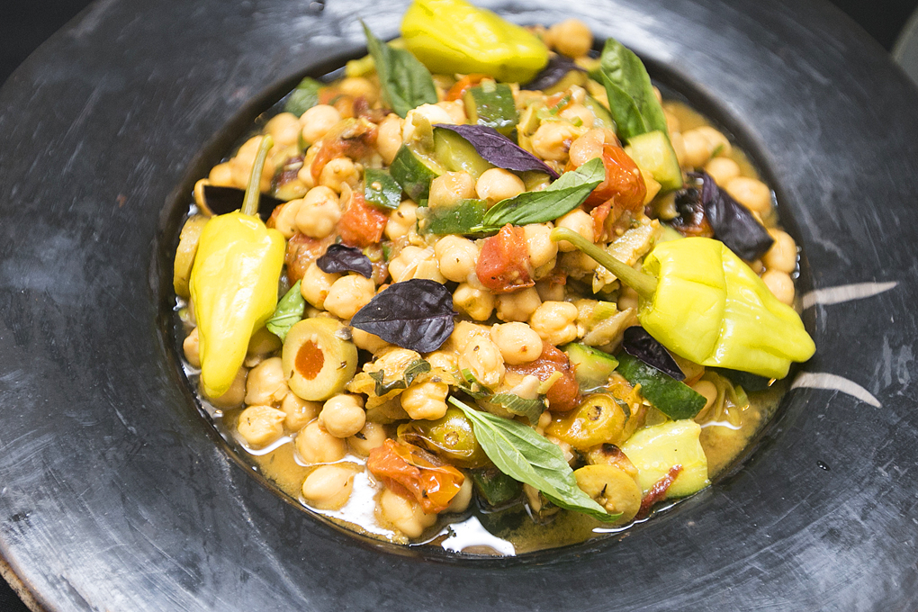 Una de las primeras entradas fue una exquisita ensalada de tomatillos, aceitunas verdes, zucchini y garbanzos, aromatizados con hojas de albahaca.
