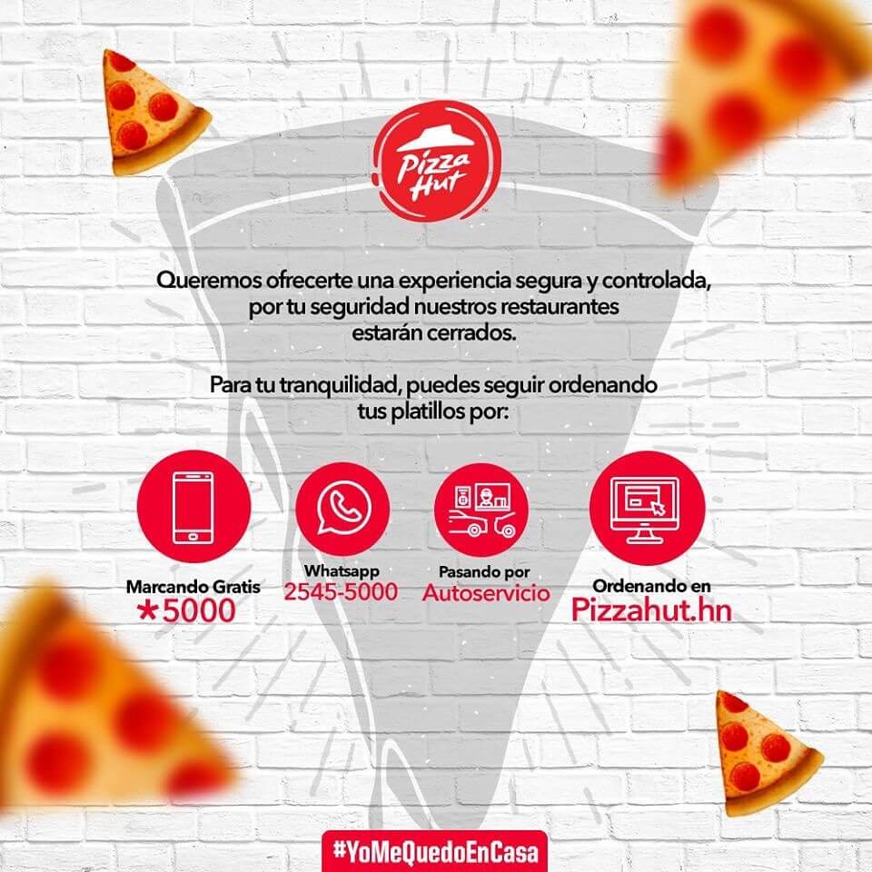 Pizza Hut también cuenta con servicio a domicilio en la puerta de tu casa. Para solicitarlo debes llamar desde tu celular al *5000 o al 2545-5000 o con su servicio al automóvil en cualquier restaurante de la capital. Visita su pagina de instagram Pizza Hut para conocer más sobre el servicio.
