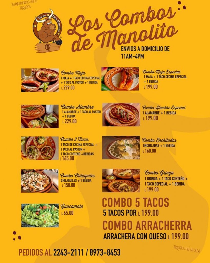 Este restaurante ofrece combos exclusivos para ser entregados a través de su servicio a domicilio. Solo tienes que llamar al 2243-2111 y al 8973-8453 para realizar tus pedidos. Estarán atendiendo en un horario de 11 de la mañana a 4 de la tarde. Síguelos en instagram como Don Manolito Hn para más información del sistema de entregas.