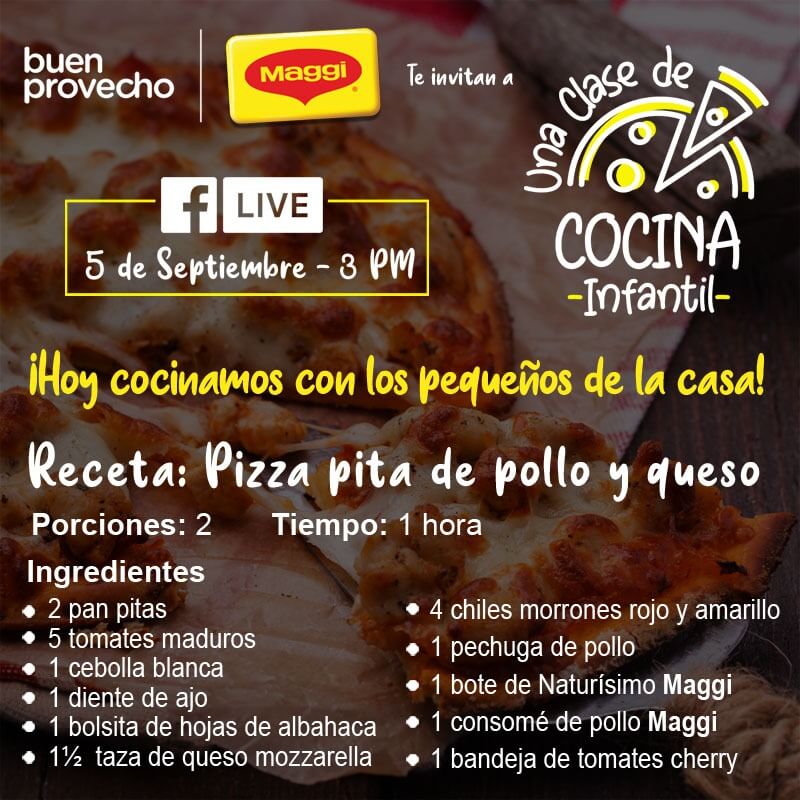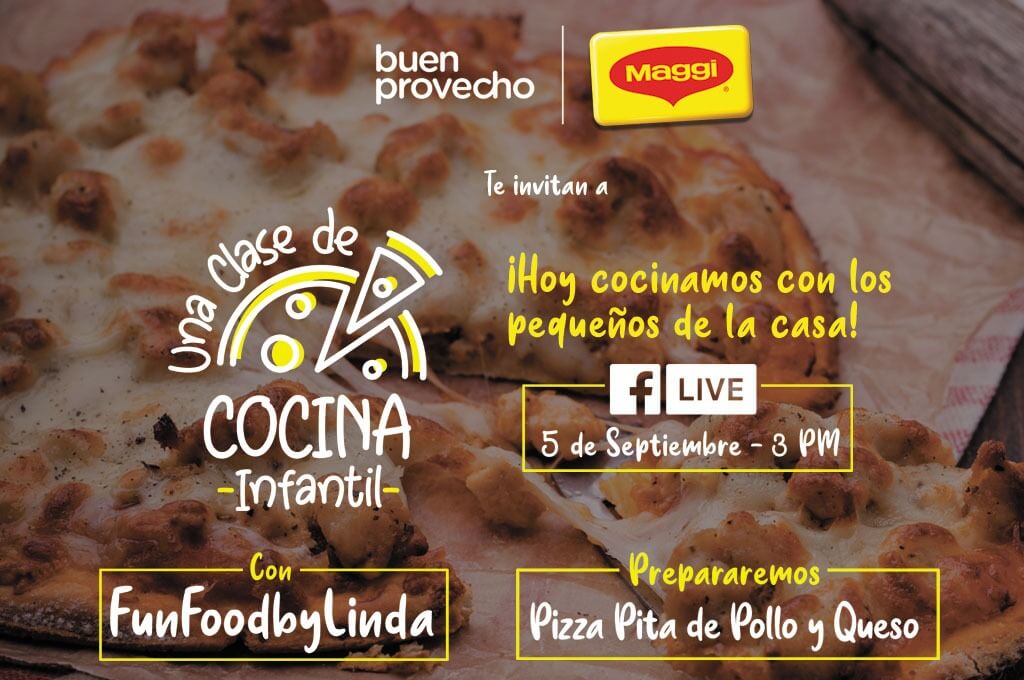 Tus pequeños se lo merecen todo, es por eso que junto a MAGGI te compartimos una clase de cocina infantil. La cita es este próximo sábado 5 de septiembre a las 3:00 PM por el Facebook Live de Buen Provecho. Linda Lagos, del blog Funfood by Linda, es la encargada de impartir la clase en la que enseñará cómo hacer una pizza pita con pollo. Una receta que puedes preparar en familia con los pequeños del hogar.