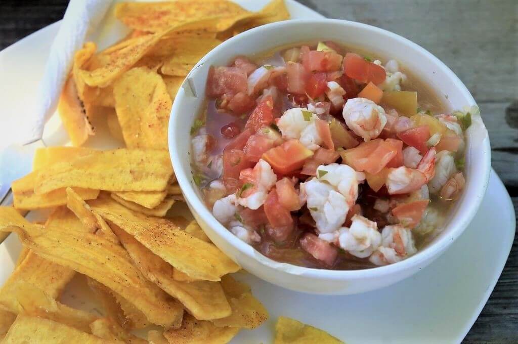 Poner a hervir una olla con agua a fuego alto. A pagar y agregar 1 libra de camarón lavado y blanquear hasta que estén color naranja, de dos a tres minutos escurrir los camarones, reservar. Colocar el camarón en un tazón, añadir ½ taza de jugo de limón, 2 tomates grandes finamente picados, 1 cebolla blanca finamente picada,1 jalapeño sin semillas finamente picado y ½ taza de cilantro finamente picado, mezclar bien todo. Sazonar al gusto y refrigerar bien tapado de una a cuatro horas. Retirar y servir con las tajadas de plátano.
