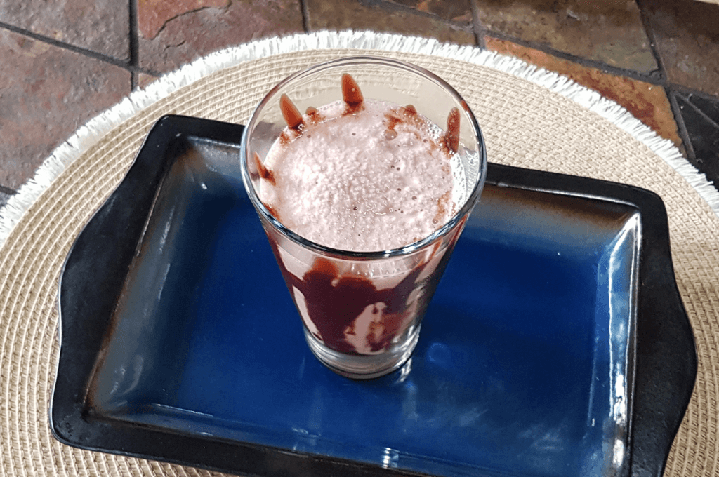Verter todos los ingredientes en la licuadora, menos chocolate. Licuar hasta que estén bien mezclados. Decorar el vaso con el chocolate líquido y verter la mezcla anterior. Disfrutar inmediatamente.