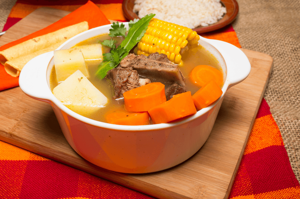 Agregar las zanahorias, papas en cubos, elotes en trozos y las hojas de cilantro grueso, rectificar sazón y cocinar por 30 minutos o hasta que todas las verduras estén blandas.Retirar y servir con arroz blanco y tortillas de maíz.
