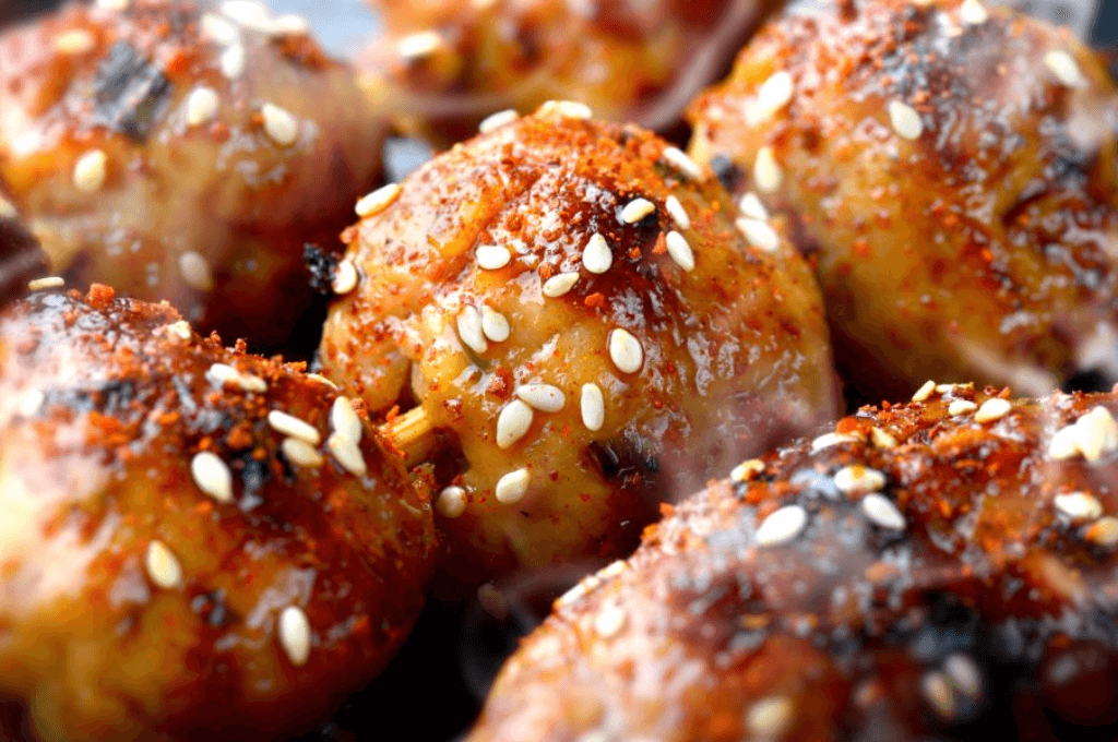 - Glasear las albóndigas con la salsa y servir con la cebollina y el ajonjolí.