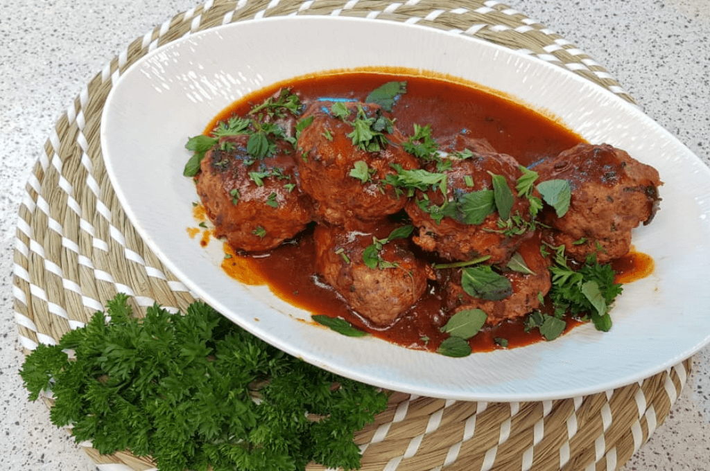 Para preparar este platillo ocupas un poco de hierbabuena, carne molida de res y carne molida de cerdo. También incluye ajos finamente picados que se mezclan con las carnes, se le añade cominos, sal y paprika. Luego deshojar la hierbabuena, picar finamente y añadir al recipiente, mezclar todo bien para incorporar los ingredientes. Ya luego, se forman las albóndigas con la medida de una cucharada grandes de la mezcla anterior.